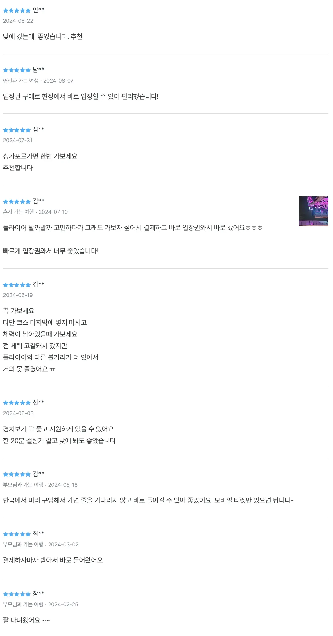 싱가포르 플라이어를 경험한 방문자들은 대체로 긍정적인 평가를 내리고 있습니다. 특히, 탁 트인 전망과 캡슐의 안락함은 많은 이들에게 인상 깊은 경험을 제공합니다. 사진 촬영을 좋아하는 방문자라면 해질녘 시간대를 추천합니다. 이 시간대에는 낮과 밤의 경치가 어우러져 더욱 멋진 장면을 연출할 수 있습니다. 예약 전 티켓 옵션을 잘 비교하고, 우선 탑승 혜택이 포함된 티켓을 선택하면 줄을 서지 않고 빠르게 입장할 수 있습니다.